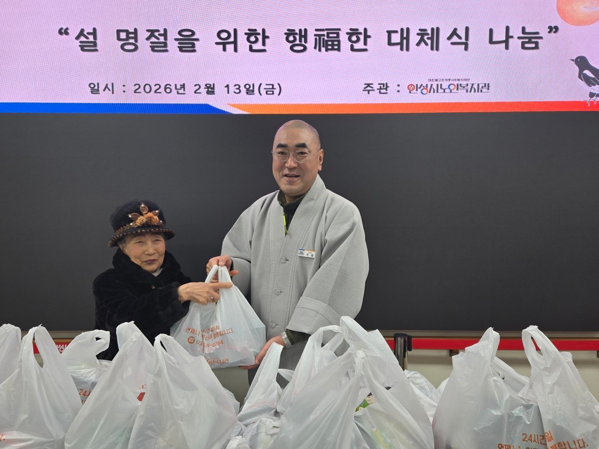 [충청뉴스큐] 대한불교조계종사회복지재단이 운영하는 안성시노인복지관은 설 명절 연휴를 맞아 2월 13일 무료급식 이용 어르신들의 결식 예방과 안정적인 식생활 지원을 위해 ‘2026년 설 명절을 위한 행 한 대체식 나눔’을 진행했다.
