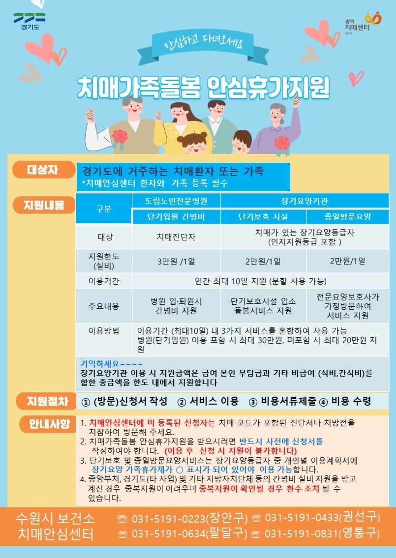 수원시 관계자는 “치매 환자 돌봄으로 지친 가족들이 잠시나마 휴식의 시간을 갖고 에너지를 재충전하길 바란다”며 “치매 환자와 가족이 안심하고 생활할 수 있는 돌봄 체계를 구축하는 데 최선을 다하겠다”고 말했다.