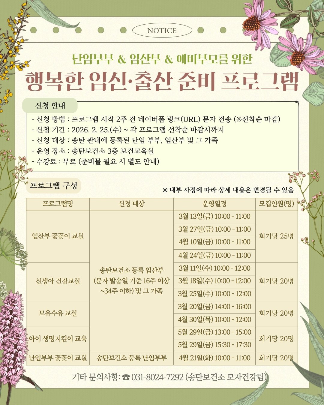 프로그램은 송탄보건소에 등록된 임산부 및 가족을 대상으로 하며 네이버 폼을 통한 선착순 접수로 진행된다.