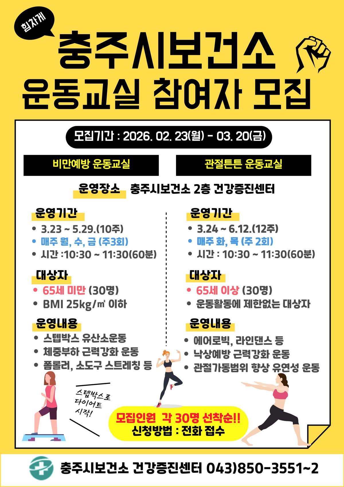 [충청뉴스큐] 충주시 보건소는 시민들의 건강한 생활 습관 형성과 활기찬 일상 회복을 위해 ‘2026년 상반기 운동교실’참여자를 오는 3월 20일까지 모집한다고 23일 밝혔다.