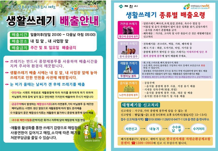 [충청뉴스큐] 제천시는 주민들의 올바른 생활쓰레기 배출과 재활용 활성화를 위해 생활쓰레기와 재활용품, 대형폐기물의 배출 요령을 안내했다.