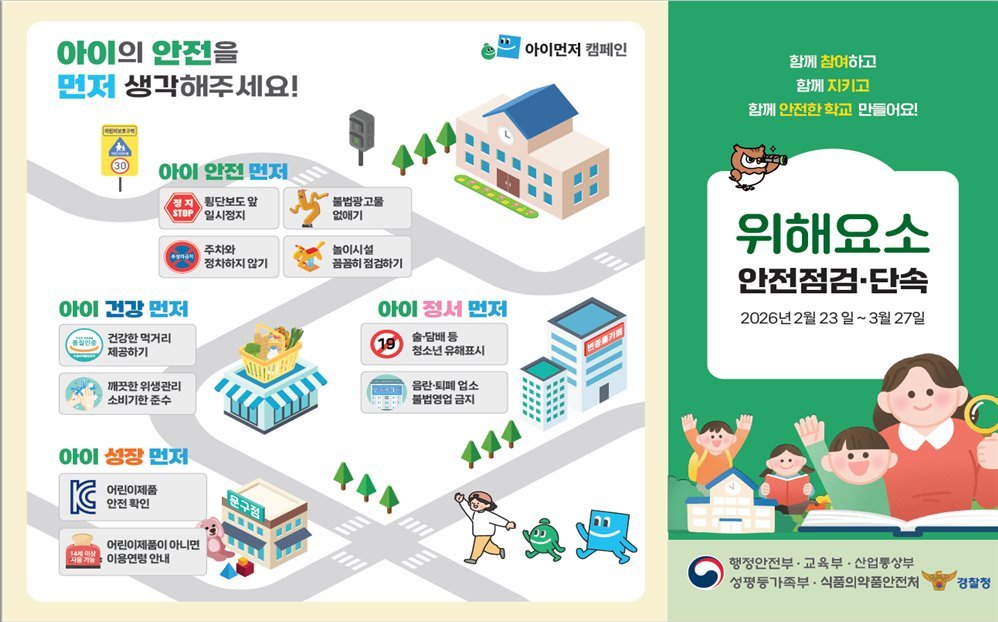 정부는 매년 개학을 앞두고 초등학교 주변 위해요소를 점검해 왔으며, 지난해에는 ▴불법광고물 45만여 건 ▴교통안전 위해요소 19만여 건 ▴청소년 유해환경 1만 7천여 건 ▴식품·위생관리 미비 1만 6천여 건을 포함해 총 67만여 건의 위해요소를 단속·정비했다.