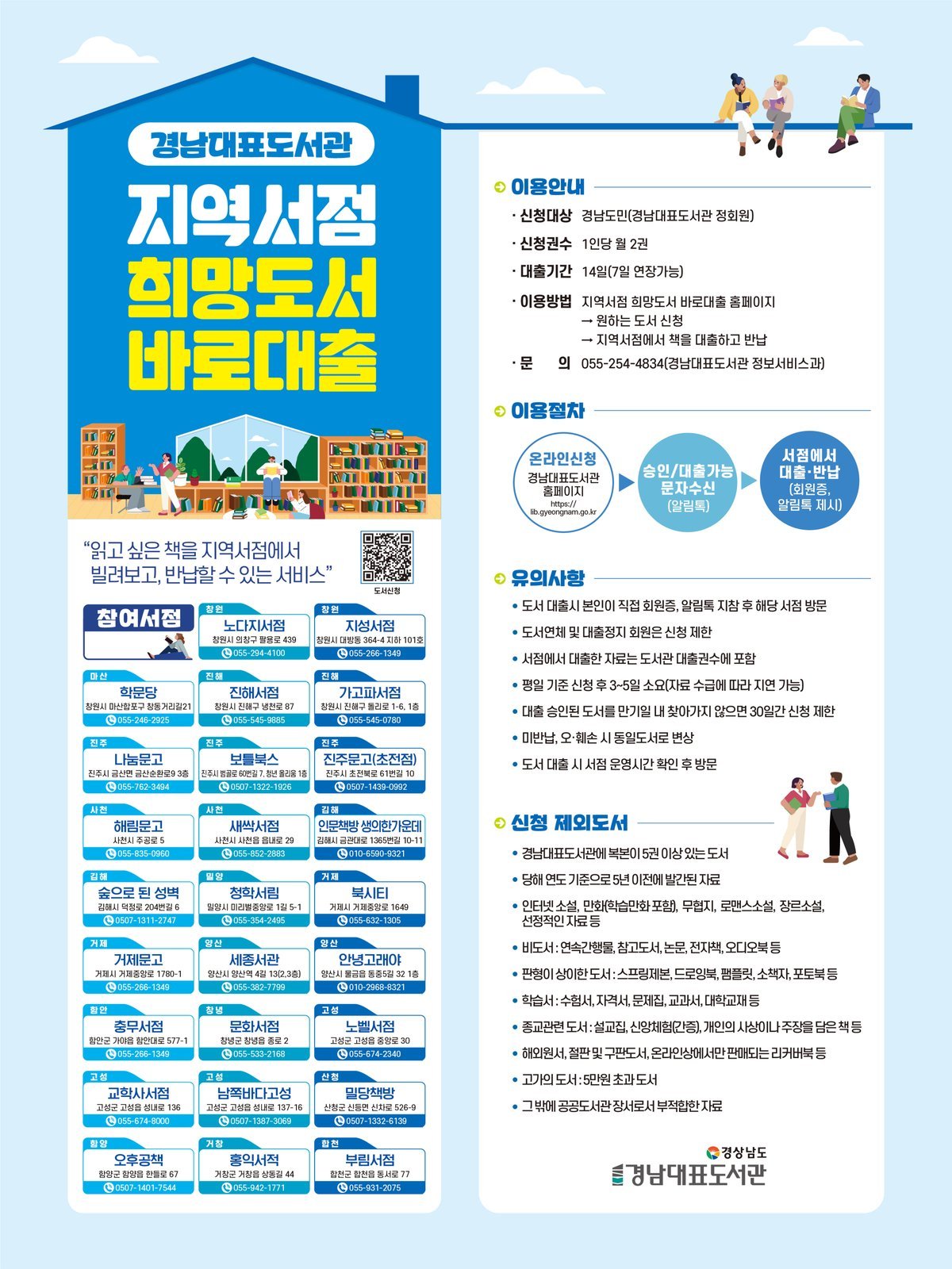도민이라면 누구나 경남대표도서관 정회원 가입 후 이용할 수 있다. 매월 1인당 2권까지 신청 가능하며, 대출 기간은 14일이다. 참여서점과 이용 방법은 경남대표도서관 누리집에서 확인할 수 있다.