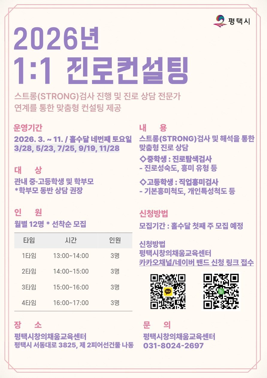 [충청뉴스큐] 평택시가 지역 내 청소년들의 진로 탐색 및 맞춤형 진로 설계를 위해 2026년도 1:1 맞춤형 진로 상담을 운영한다.