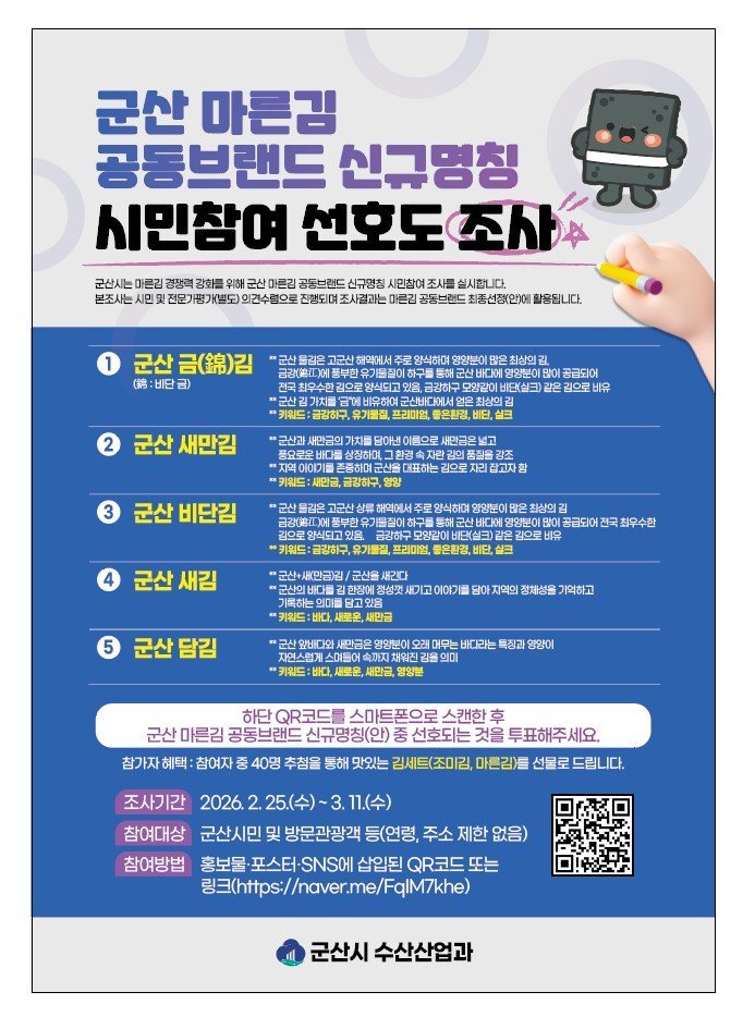[충청뉴스큐] 군산시는 ‘군산김’명품화를 위한 마른김 공동브랜드 명칭 선호도 조사를 오는 2월 25일부터 3월 11일까지 15일간 실시한다고 밝혔다.