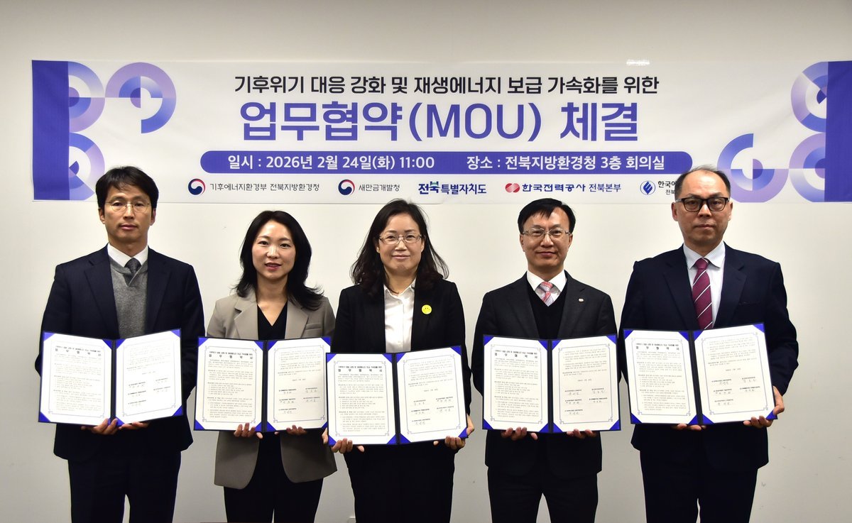 [충청뉴스큐] 전북특별자치도는 24일 전북지방환경청, 새만금개발청, 한국전력공사 전북본부, 한국에너지공단 전북지역본부와 함께 전북지역 재생에너지 보급 가속화를 위한 업무협약을 체결하고 기후위기 대응과 에너지 대전환 실현을 위한 협력에 나섰다.