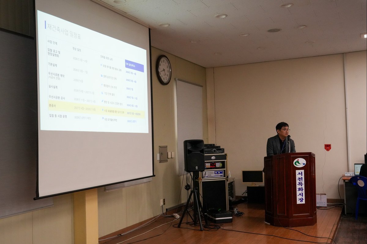 [충청뉴스큐] 서천군은 지난해 화재로 전소된 서천특화시장의 재건을 위해 추진 중인 재건축사업이 시공사 법정관리 등으로 지연됨에 따라 상인과 지역 주민들의 우려가 커지고 있는 가운데, 지난 23일 상인 설명회를 열고 향후 추진 일정과 대책을 공유했다.