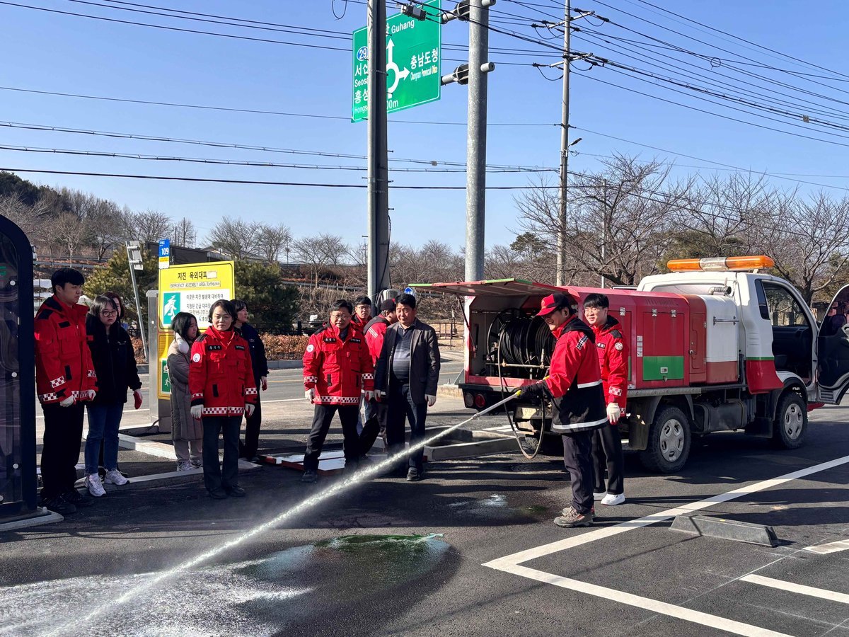 교육의 핵심은 산불진화차량 사용법으로 차량 기본 조작, 펌프 작동, 호스 연결과 방수 절차, 안전수칙 등을 실제 장비를 활용해 실습 중심으로 진행됐다.