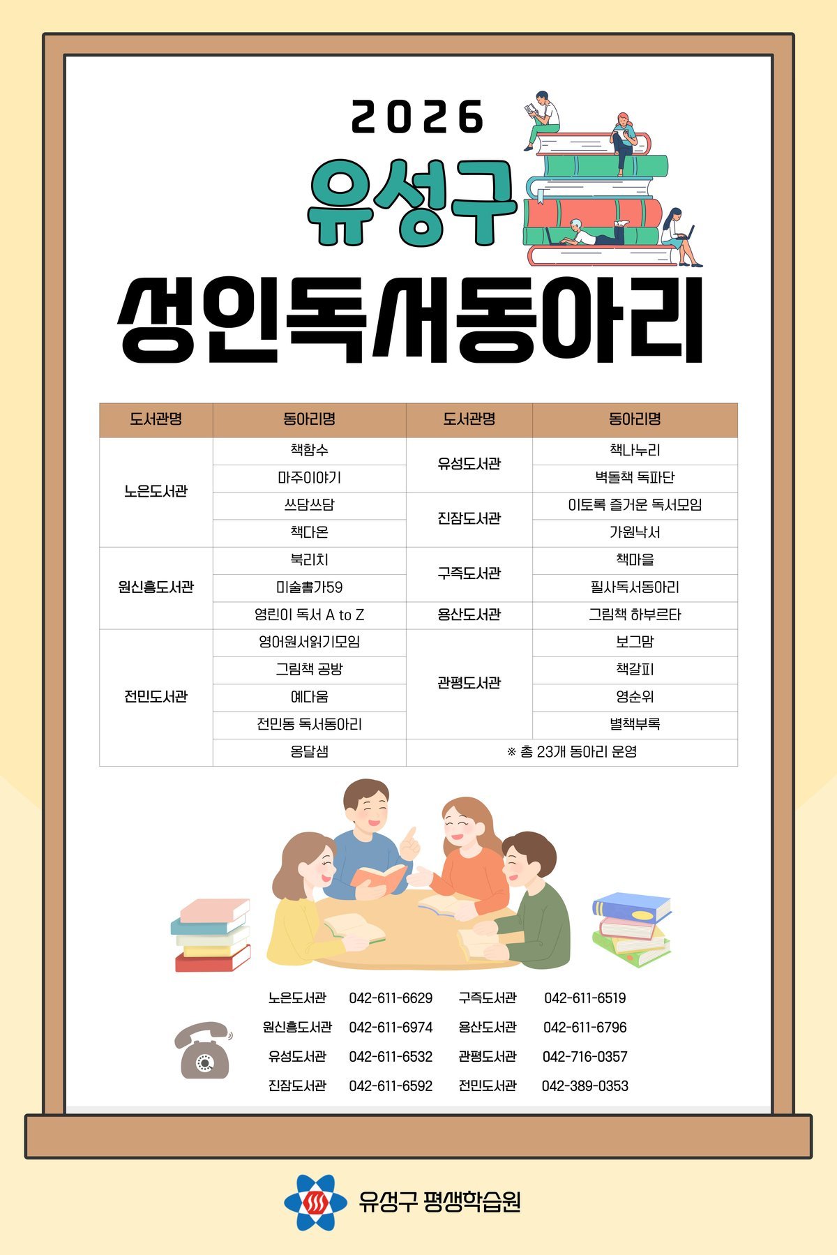 [충청뉴스큐] 대전 유성구는 관내 8개 공공도서관에서 지역 주민의 독서 공동체 문화 확산을 위해 '2026년 성인 독서동아리'를 연중 운영한다고 25일 밝혔다.