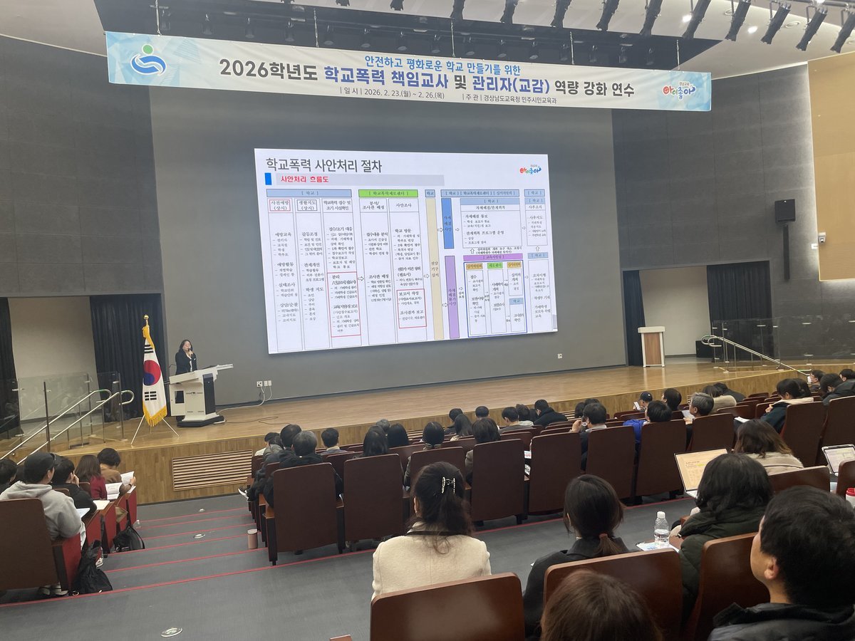 [충청뉴스큐] 경상남도교육청은 23일부터 26일까지 4일간 의령 미래교육원에서 초·중·고등학교 학교폭력 책임 교사와 교감 등 관리자를 대상으로 '2026년 학교폭력 책임교사 및 관리자 권역별 역량 강화 연수'를 연다.