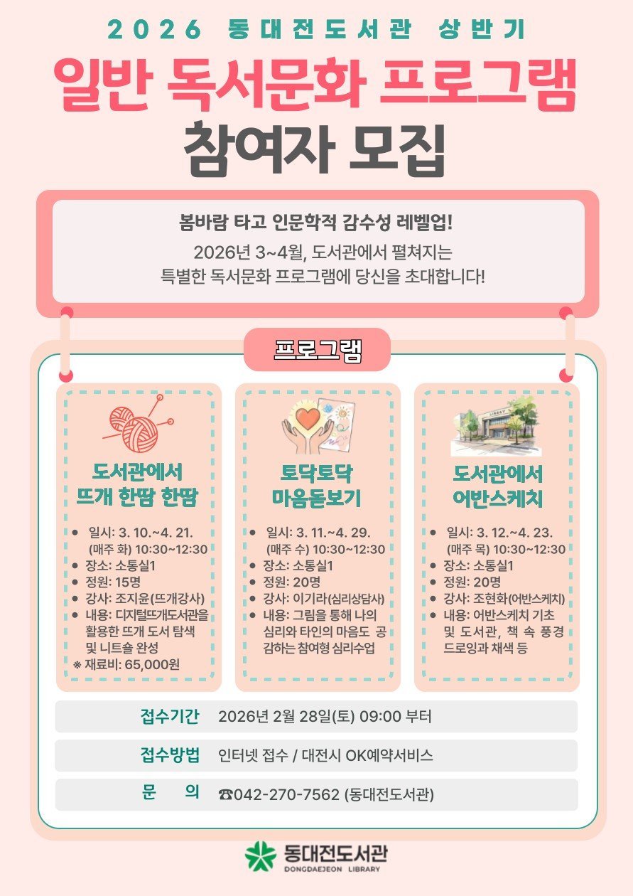 [충청뉴스큐] 동대전도서관은 새봄을 맞아 3월부터 4월까지 시민들의 문화 향유 기회 확대를 위한 상반기 성인 독서문화 프로그램 을 운영한다.
