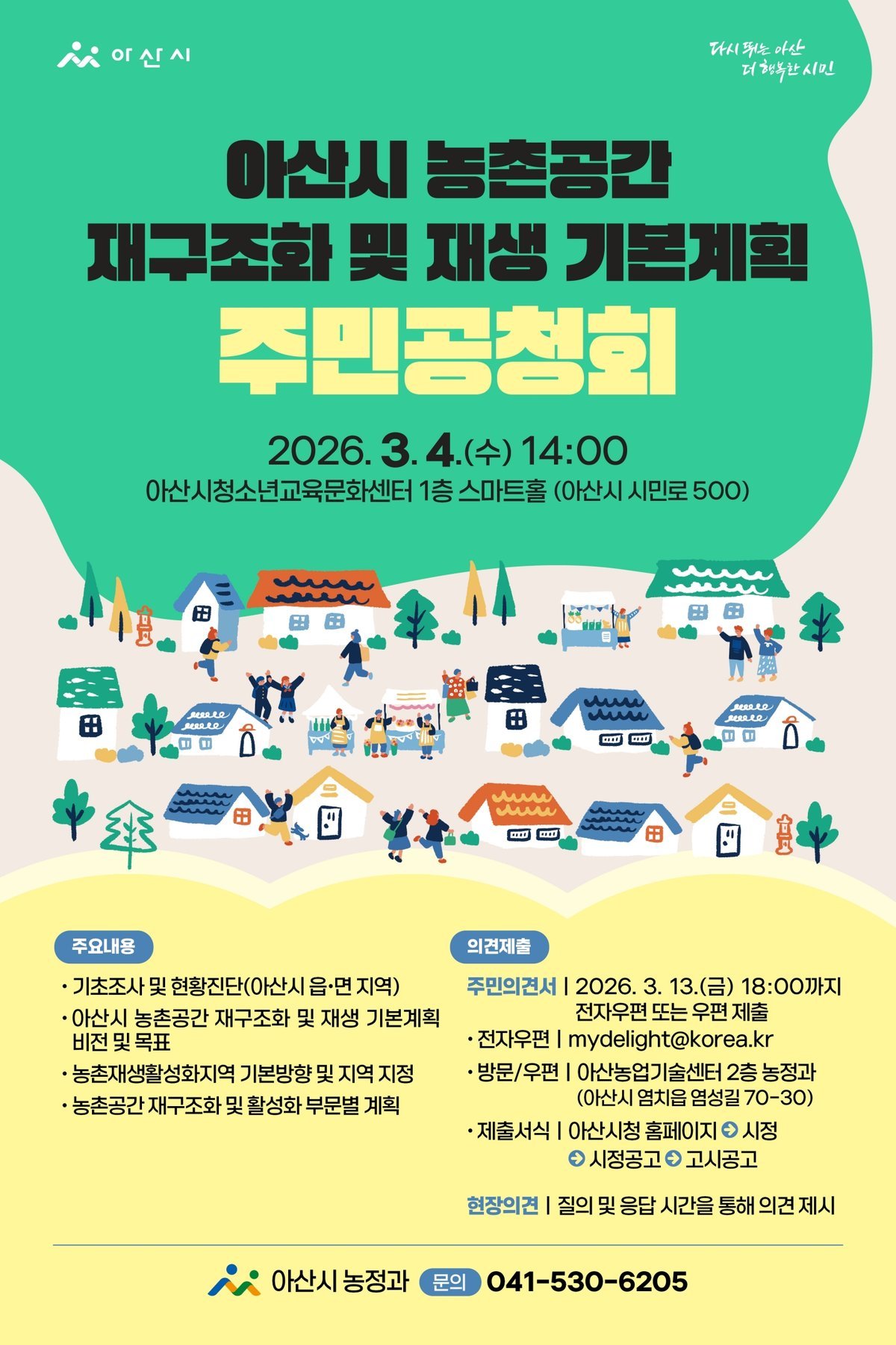 [충청뉴스큐] 아산시는 농촌공간 재구조화 및 재생 기본계획 수립과 관련해 지역 주민과 관계 전문가의 의견을 수렴하기 위한 주민공청회를 오는 3월 4일 오후 2시, 아산시 청소년교육문화센터 1층 스마트홀에서 개최한다.