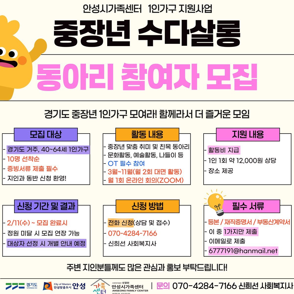 [충청뉴스큐] 안성시 가족센터는 경기도 거주 중장년 1인 가구를 대상으로 사회적 관계망 형성을 위한 ‘중장년 수다살롱’동아리 참여자를 모집한다.