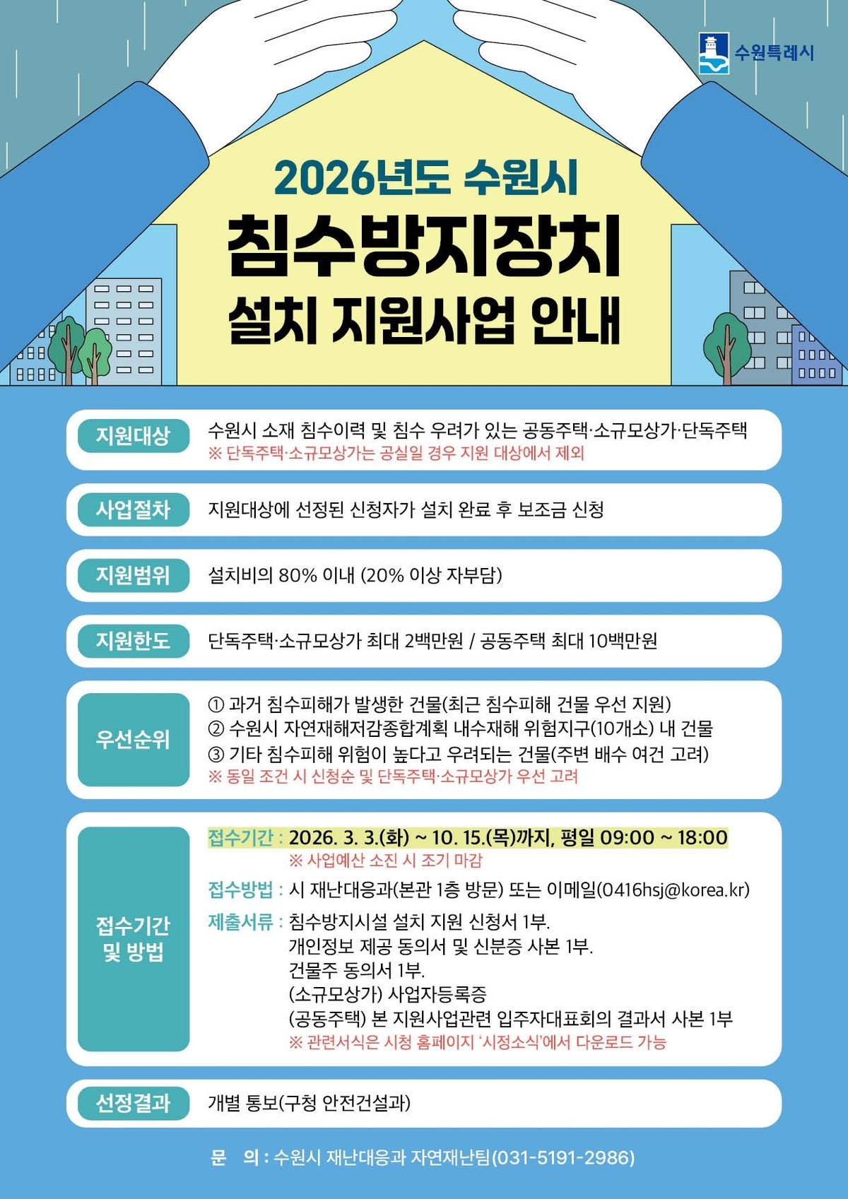 지원 대상은 침수 이력·우려가 있는 공동주택·소규모 상가·단독주택이다. 우선순위는 △과거 침수 피해가 발생했던 건물 △수원시 자연재해저감종합계획 내수재해 위험지구 내 건물 △침수 피해 위험도가 높다고 우려되는 건물이다.