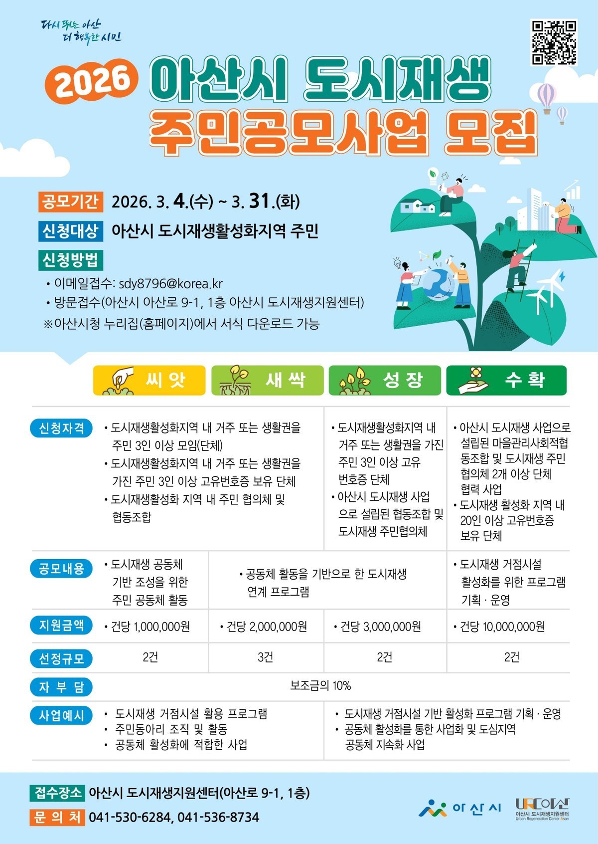 [충청뉴스큐] 아산시는 주민 주도의 지역 활성화 기반을 확대하기 위해 2026년 아산시 도시재생 주민공모사업 신청을 오는 3월 4일부터 3월 31일까지 접수한다고 밝혔다.