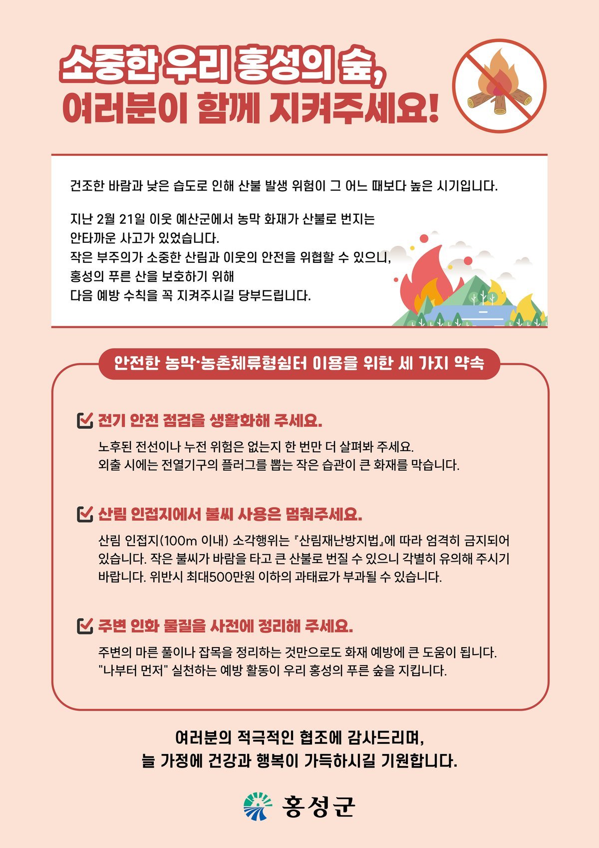 홍성군은 이번 조치를 계기로 산림 인접 시설 중심의 자율 안전관리 체계를 강화하고 지속적인 홍보와 점검을 병행해 화재 위험 요인을 사전에 관리해 나갈 계획이다.