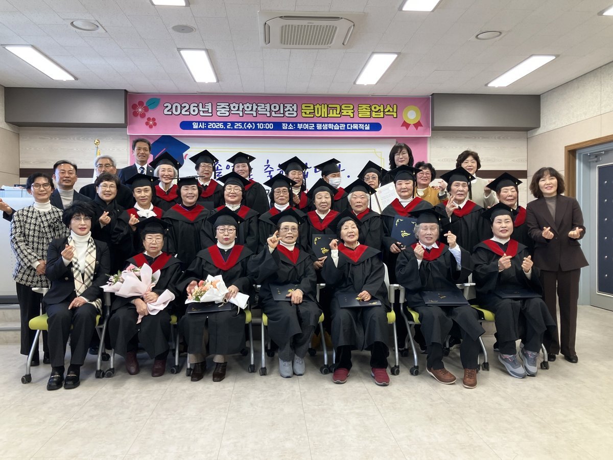 [충청뉴스큐] 부여군은 부여군 평생학습관 3층 다목적실에서 ‘2026년 중학학력인정 문해교육 졸업식’을 개최하고 배움의 열정으로 가득 찼던 3년간의 과정을 마친 25명의 어르신에게 졸업장을 수여했다고 4일 밝혔다.