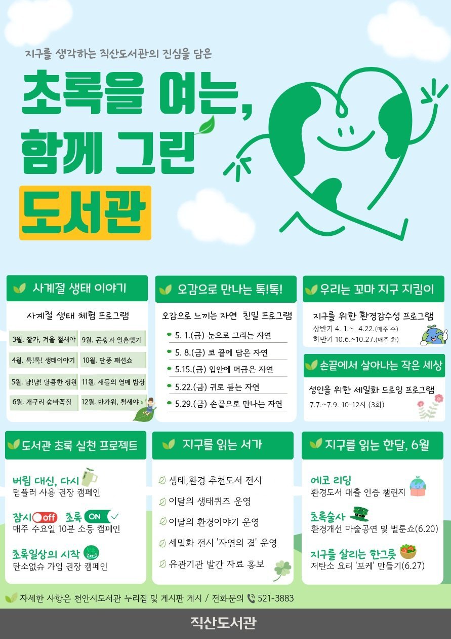 [충청뉴스큐] 천안시 직산도서관이 올해 생태와 환경을 주제로 ‘초록을 여는, 함께 GREEN 도서관’을 운영한다고 4일 밝혔다.