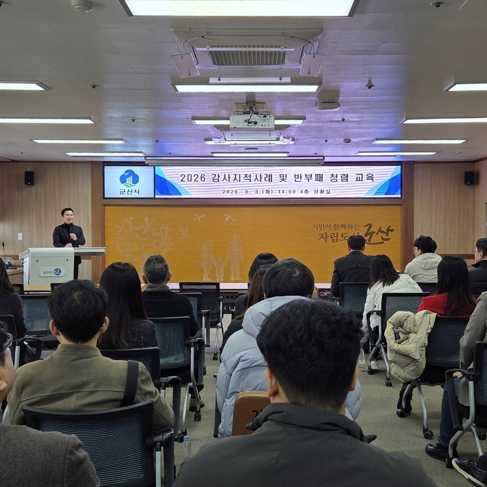 [충청뉴스큐] 군산시는 지난 3월 3일 시청 상황실에서 27개 읍, 면, 동 회계업무 담당 계장 및 직원들을 대상으로 ‘감사사례 및 부패방지 청렴 교육’을 실시해 행정 신뢰도 제고와 청렴 문화 확산의 계기를 조성했다.