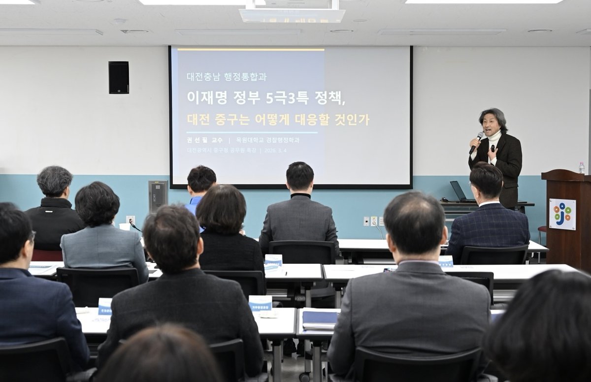 강의를 맡은 목원대학교 권선필 교수는 ‘대전충남 행정통합과 정부 5극 3특 정책, 대전 중구는 어떻게 대응할 것인가’를 주제로 심도 있는 강연을 진행했다.
