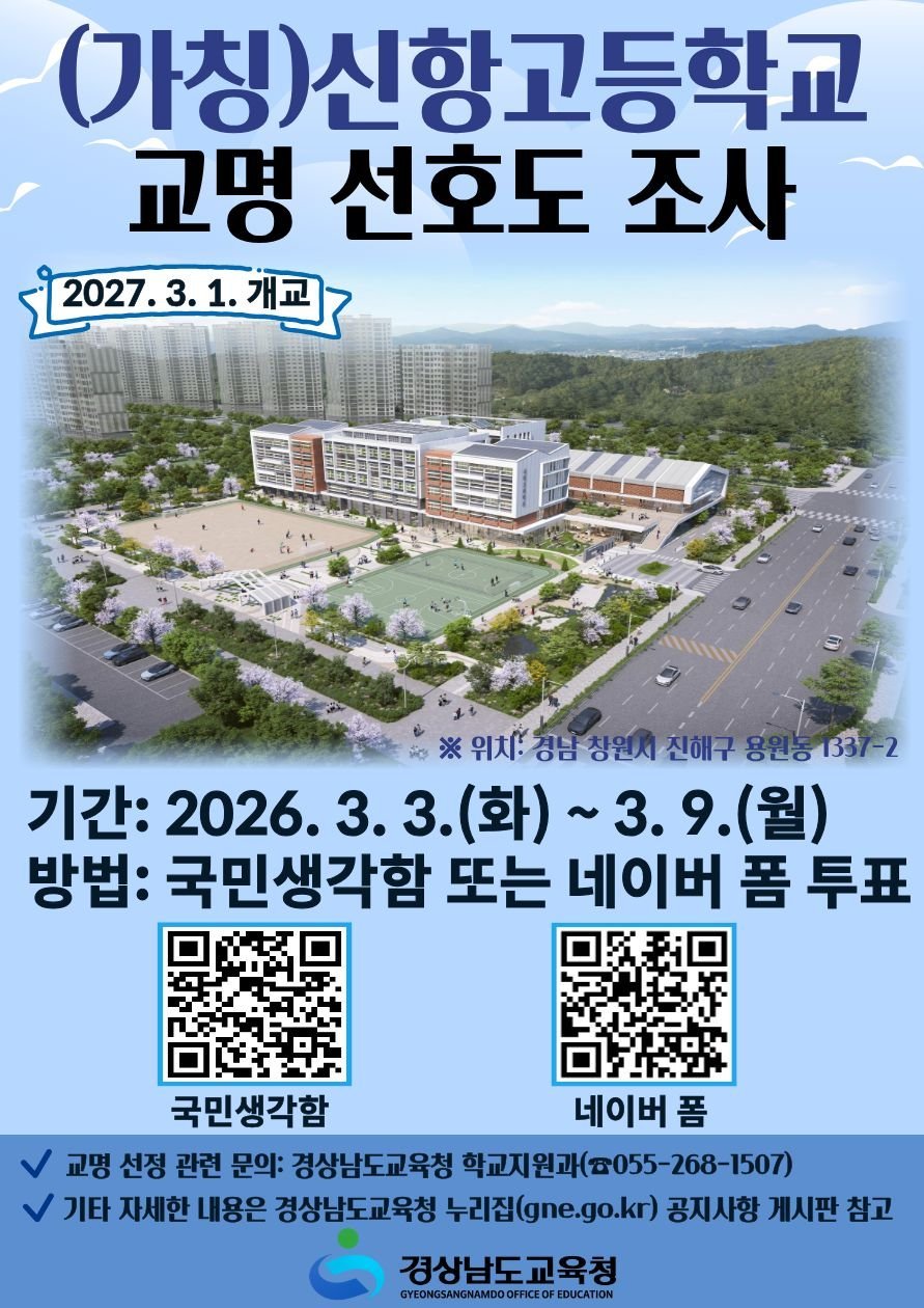 [충청뉴스큐] 경상남도교육청은 2027년 3월 문을 여는 신설 학교 3곳의 이름을 정하기 위해 오는 3일부터 9일까지 도민 선호도 조사를 진행한다.