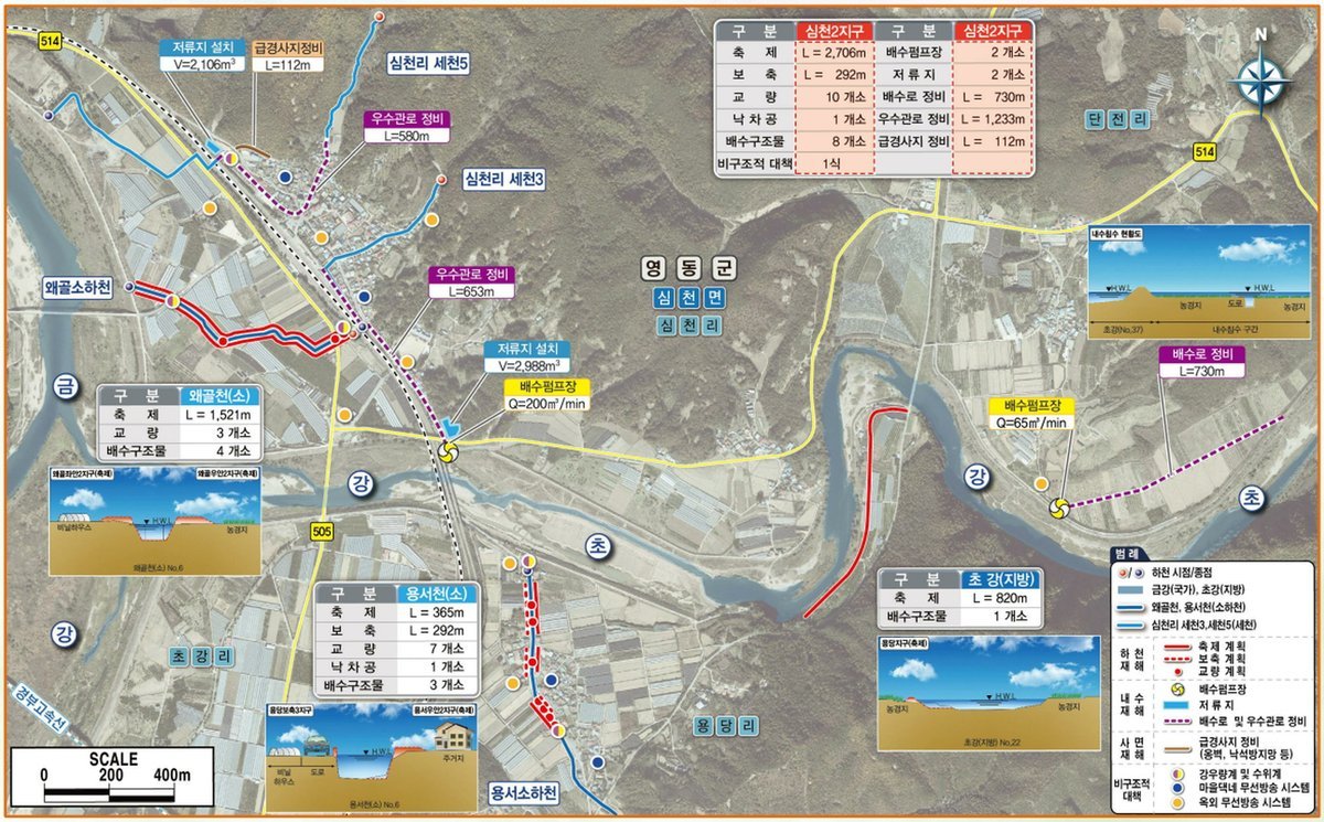 이번 사업은 심천2지구 내 하천 내수 사면 재해 등 복합적인 위험 요인을 종합적으로 정비하는 대규모 사업으로 총사업비는 약 401억원 규모이다.
