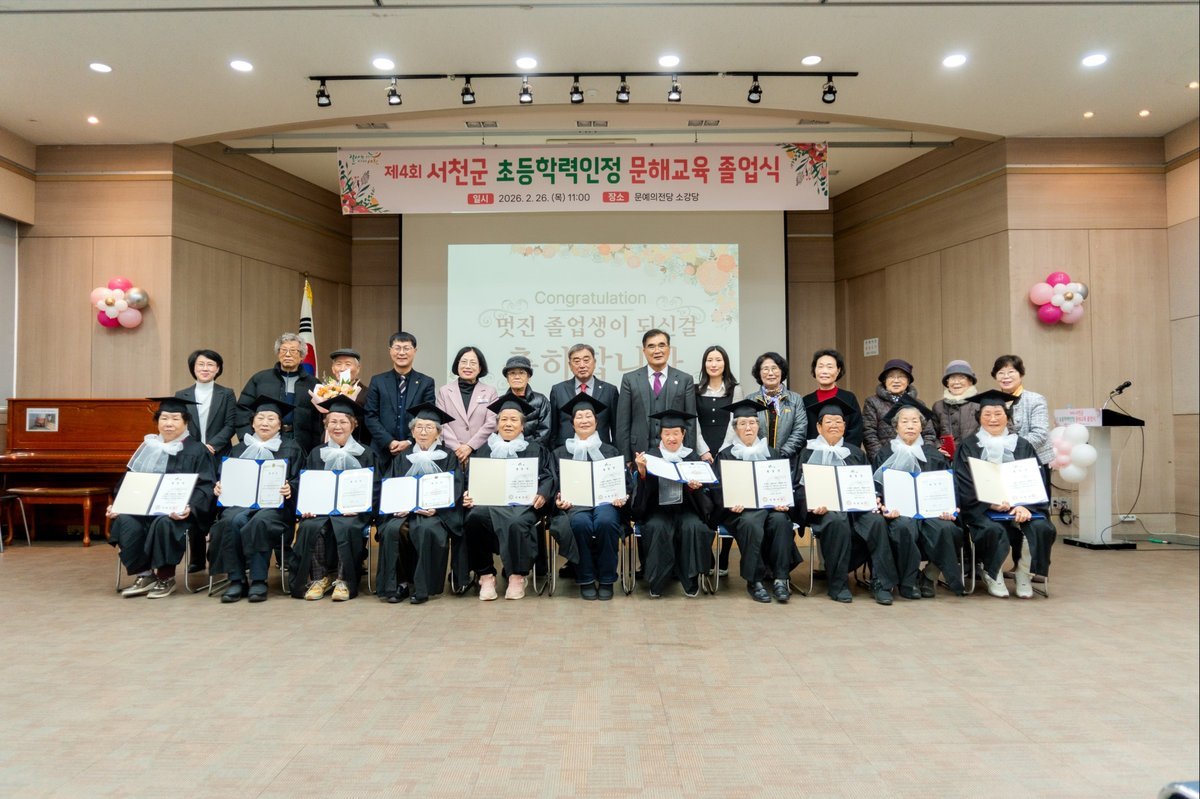 [충청뉴스큐] 서천군은 지난 26일 서천문예의전당에서 졸업생과 가족, 문해교사 등 50여명이 참석한 가운데 ‘제4회 초등학력인정 문해교육 졸업식’을 개최했다.