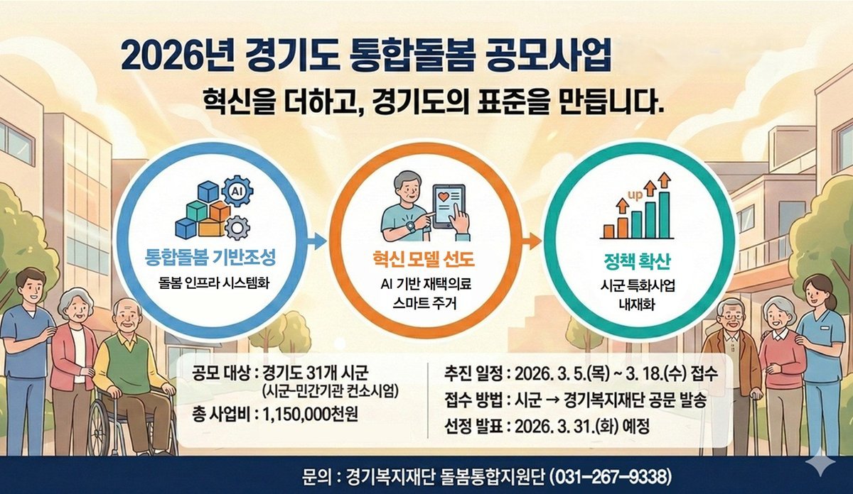 경기복지재단 관계자는 "이번 공모사업은 AI 등 혁신 기술로 돌봄의 틈새를 메우고 시군의 지속가능한 지역 돌봄체계 구축을 지원하는 발판이 될 것"이라며 "경기도가 통합돌봄의 표준을 확립해 도민의 삶의 질을 높이는 데 최선을 다하겠다"고 밝혔다.