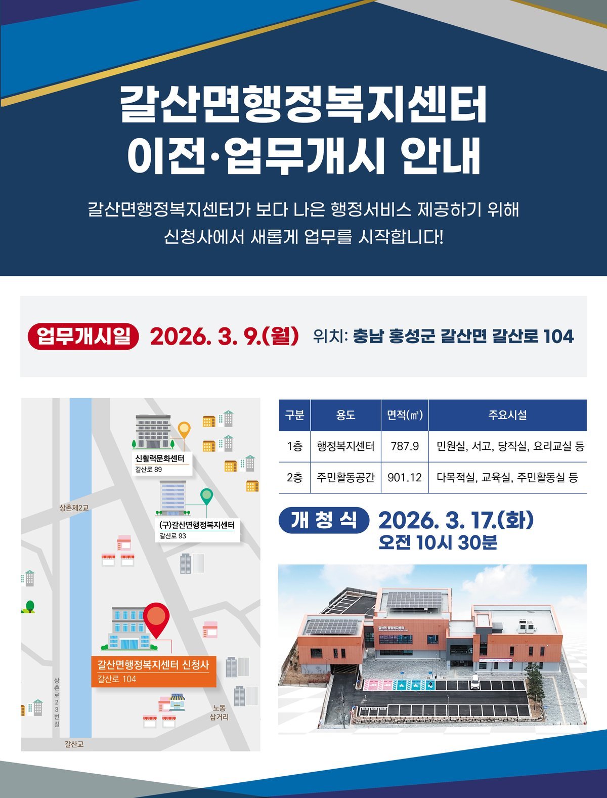 갈산면 행정복지센터는 오는 3월 17일 신청사 개청식을 개최할 예정이다.