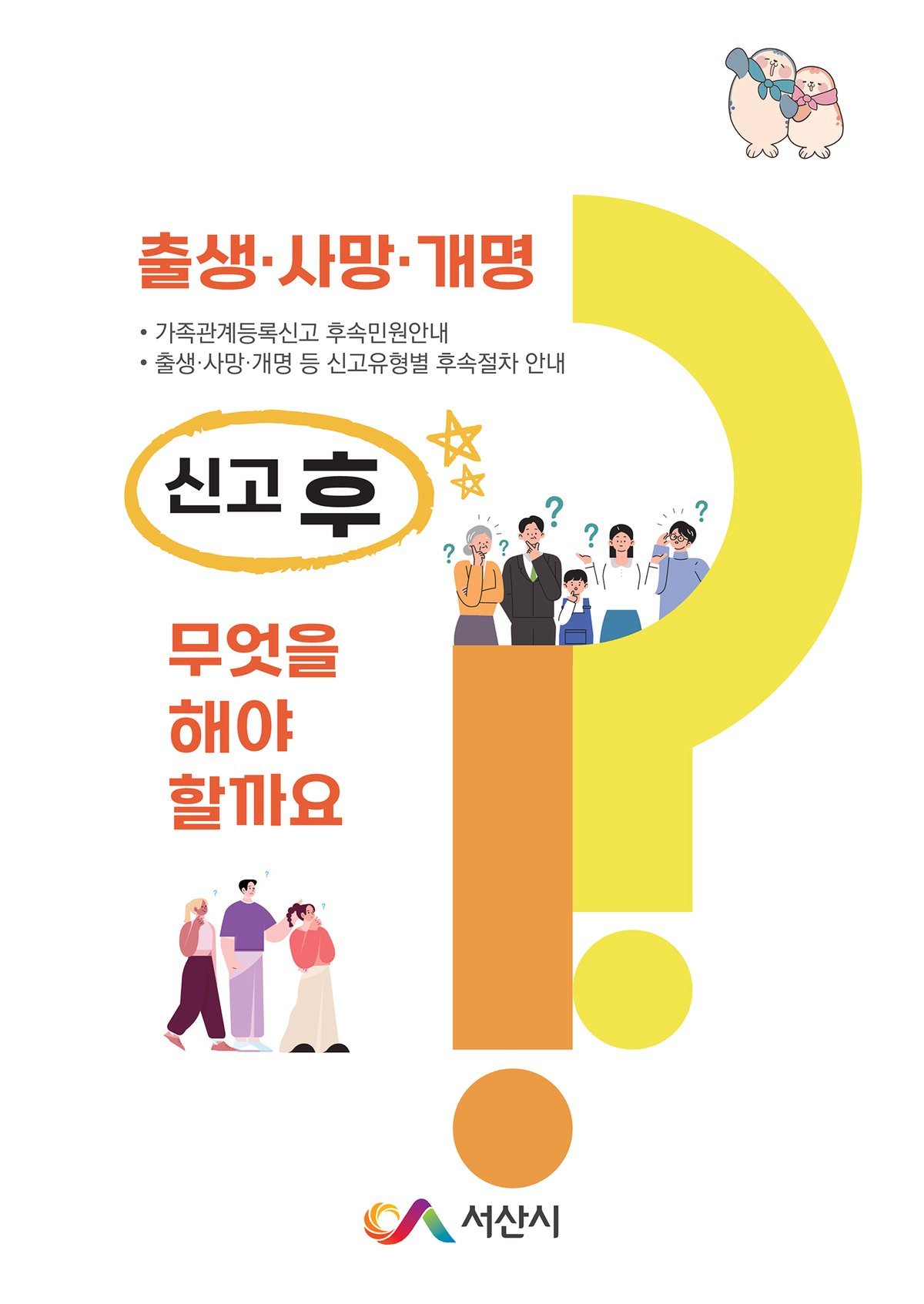 [충청뉴스큐] 충남 서산시는 가족관계등록신고에 대한 후속민원을 한눈에 알아볼 수 있도록 ‘출생 사망 개명 신고 후 무엇을 해야 할까요?’책자를 발간했다고 밝혔다.