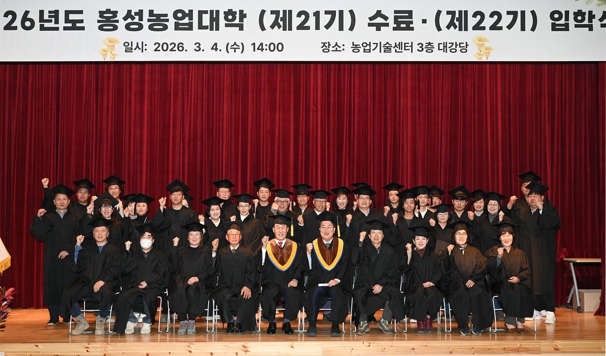 홍성군은 4일 농업기술센터 3층 대강당에서 ‘2026년도 홍성농업대학 제21기 수료 및 제22기 입학식’을 개최했다고 밝혔다.