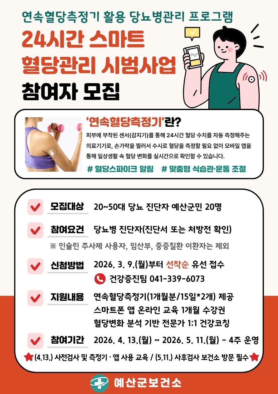 [충청뉴스큐] 예산군보건소는 오는 3월 9일부터 ‘24시간 스마트 혈당관리 시범사업’참여자 20명을 선착순 모집한다.
