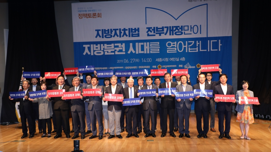 김종천 대전광역시의회 의장은 27일 세종특별자치시청에서 열린 대전·세종·충북·충남도 등 4개 시도의회에서 공동 주최하고 세종시에서 주관한‘지방자치법 전부개정을 위한 정책토론회’에 참석했다. 이번 토론회에서는‘지방의회 인사권독립과 정책지원 전문인력 도입, 예산편성 자율성 확대’등 지방의회 역량강화 방안을 담은 지방자치법 개정안 조속 통과에 대하여 뜻을 같이하고, 충청권 4개 시도의회가 공동 대응하는 결의의 시간을 가졌다.