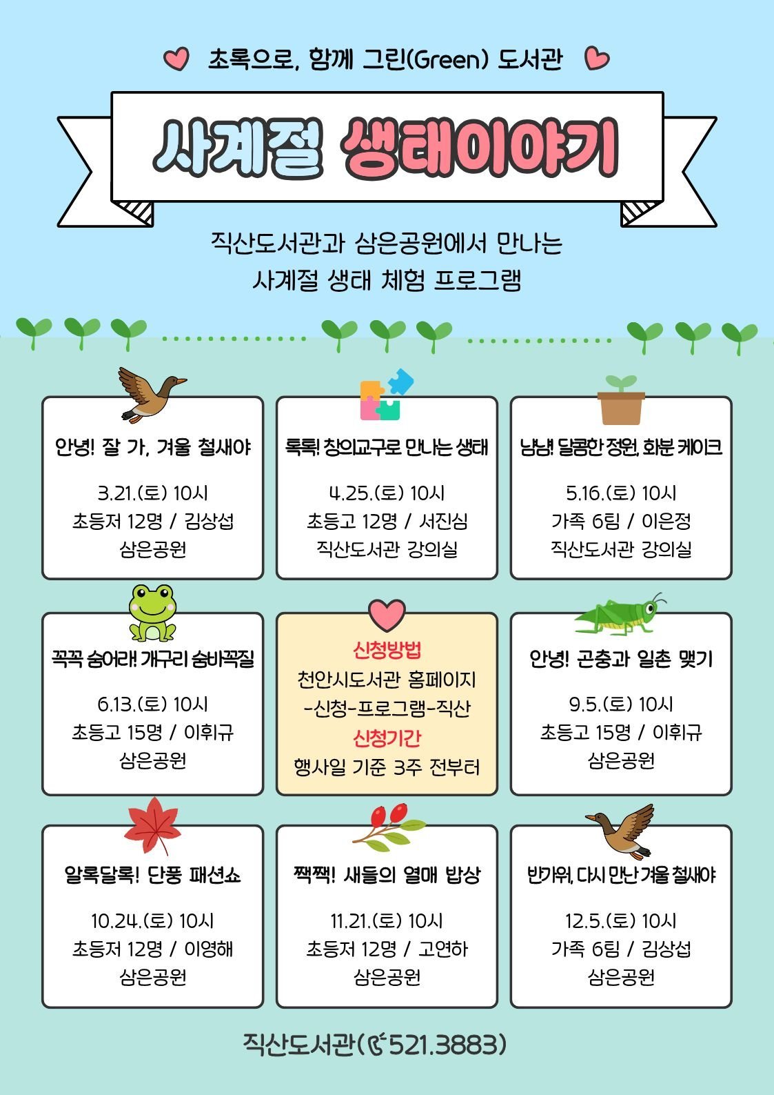 사계절 생태이야기는 올해 직산도서관의 특화주제 사업인 ‘초록을 여는, 함께 GREEN 도서관’의 첫 번째 프로그램으로 천안시지속가능발전협의회와 협력해 상 하반기로 나눠 운영한다.