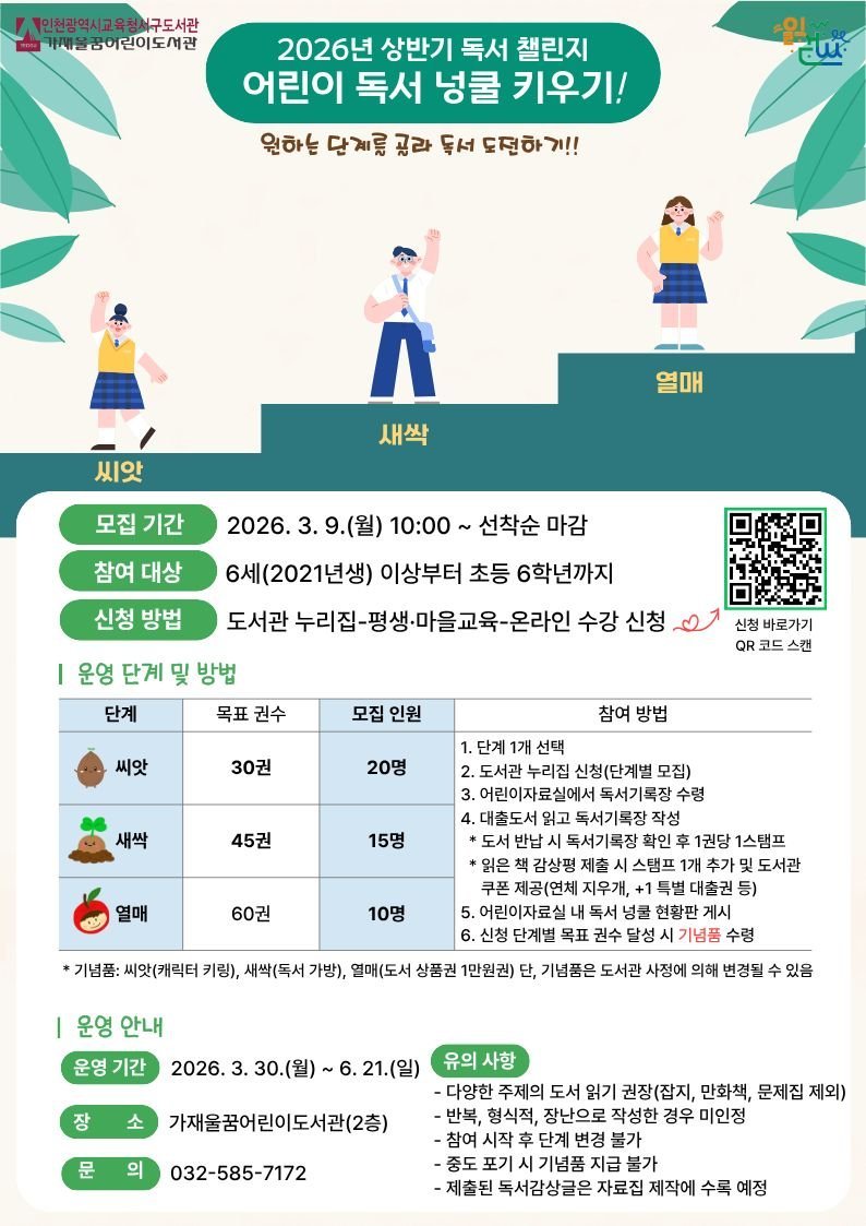 [충청뉴스큐] 인천광역시교육청서구도서관은 어린이의 올바른 독서 습관 형성과 도서관 이용 활성화를 위해 오는 9일부터 독서 챌린지 ‘어린이 독서 넝쿨 키우기’참여자를 모집한다.