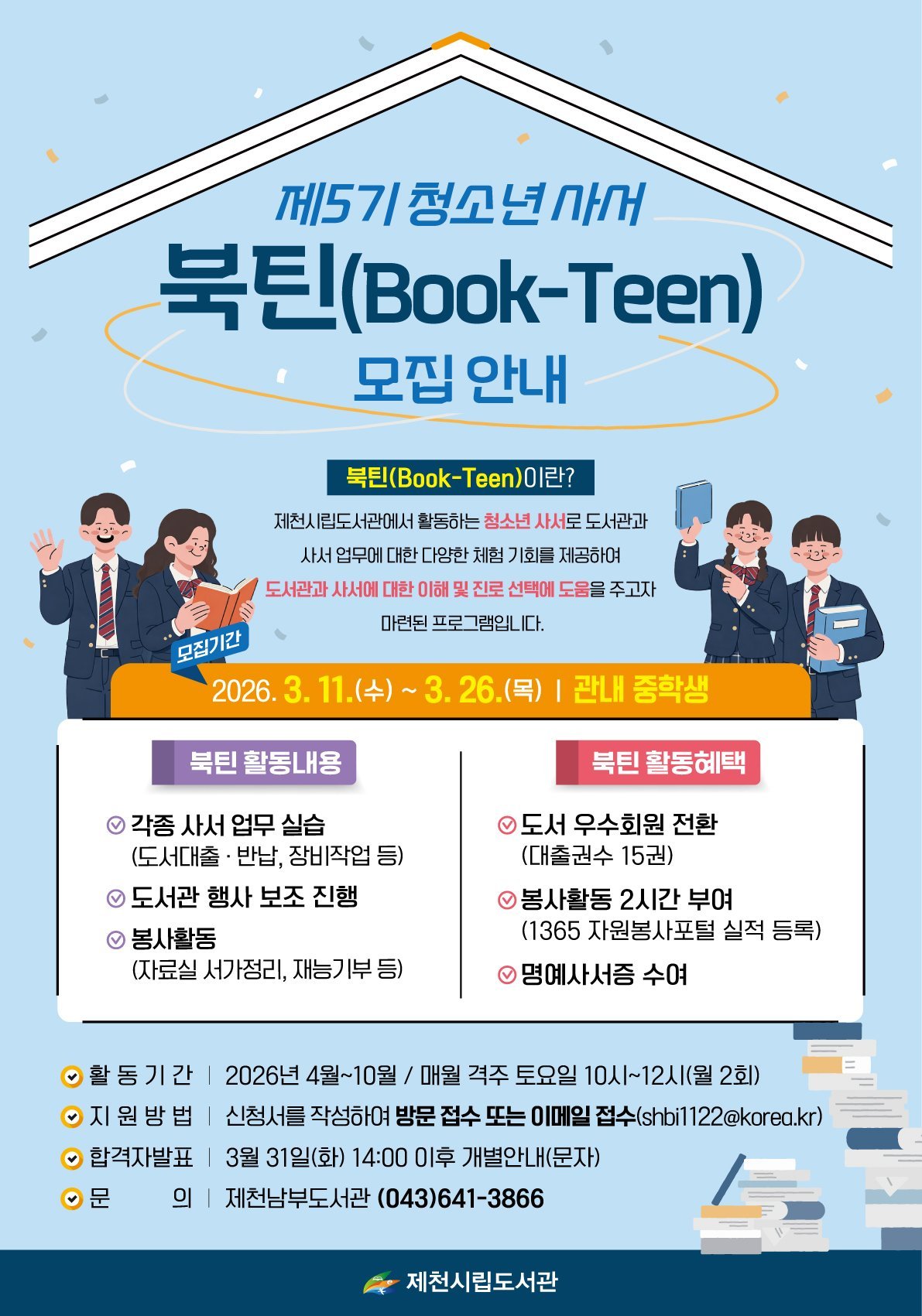 [충청뉴스큐] 제천시립도서관은 2026년 제5기 청소년 사서 ‘북틴’을 모집한다.