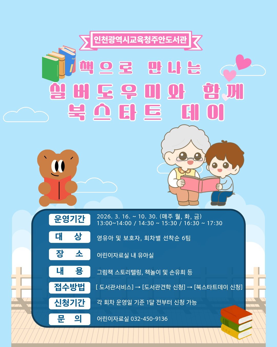 [충청뉴스큐] 인천광역시교육청주안도서관은 오는 3월 16일부터 10월 30일까지 영유아 및 보호자를 대상으로 ‘책으로 만나는 실버도우미와 함께 북스타트 데이’를 운영한다.