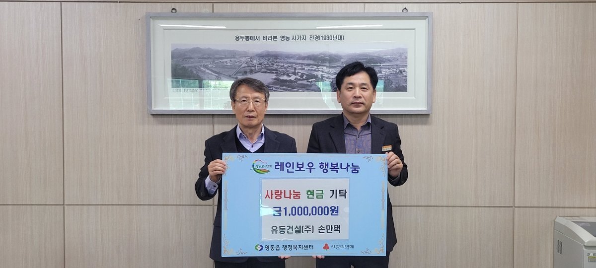 [충청뉴스큐] 유동건설 은 10일 영동읍을 방문해 어려운 이웃을 위해 써 달라며 성금 100만원을 기탁했다.
