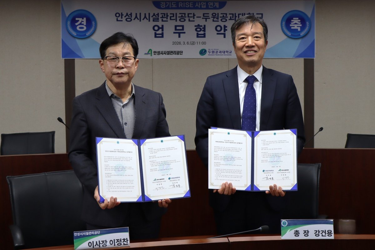[충청뉴스큐] 안성시시설관리공단은 두원공과대학교와 지난 6일 금요일 11시 두원공과대학교 안성캠퍼스 철산학술정보관 5층 영상회의실에서 경기도 지역혁신중심 대학지원체계사업과 연계한 ‘지역상생 및 주차시설 운영 전문성 강화’를 위한 업무협약을 체결했다고 밝혔다.