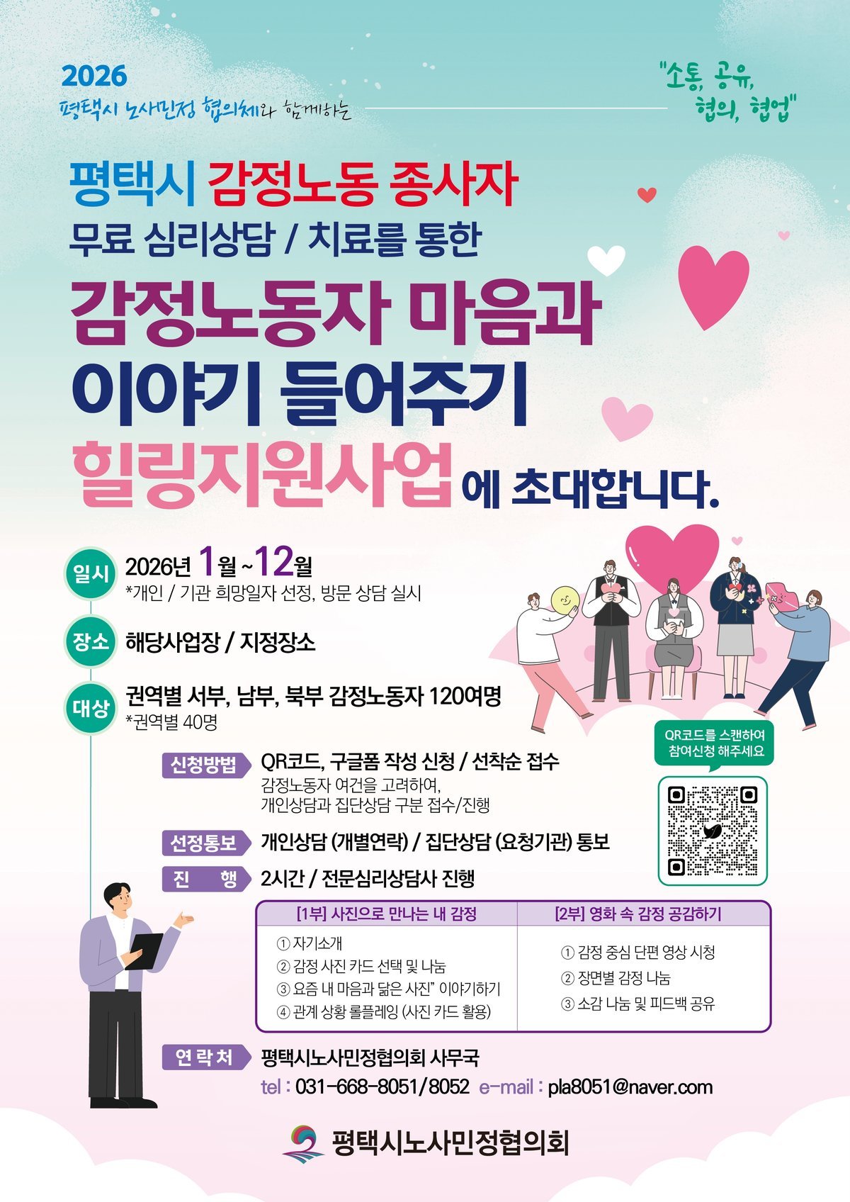 한편, 감정노동 종사자를 위한 심리상담을 희망하는 기관 또는 개인은 구글 폼을 통해 신청하거나 평택시노사민정협의회 사무국으로 문의하면 된다.