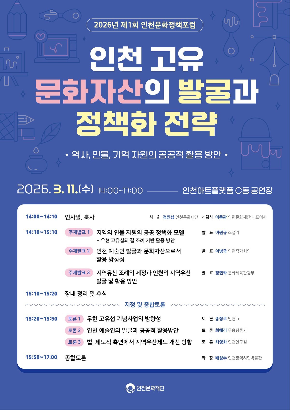 이번 포럼은 인천의 고유 문화자산을 단순한 보존 대상이 아닌 공공정책의 자원으로 전환하는 전략을 논의하는 자리로 시민 예술인 학계 문화기관 관계자 등이 함께 참여하는 정책 공론장으로 운영된다.