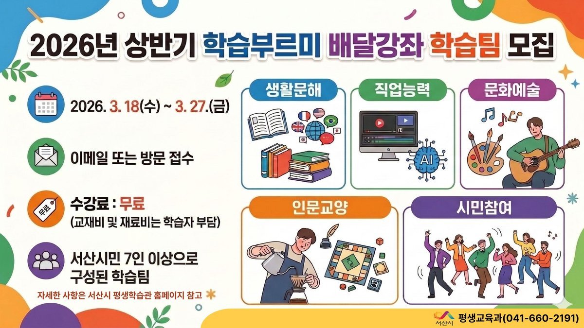 [충청뉴스큐] 충남 서산시는 오는 3월 18일부터 27일까지 ‘2026년 상반기 학습부르미 배달강좌’에 참여할 학습팀을 모집한다고 밝혔다.