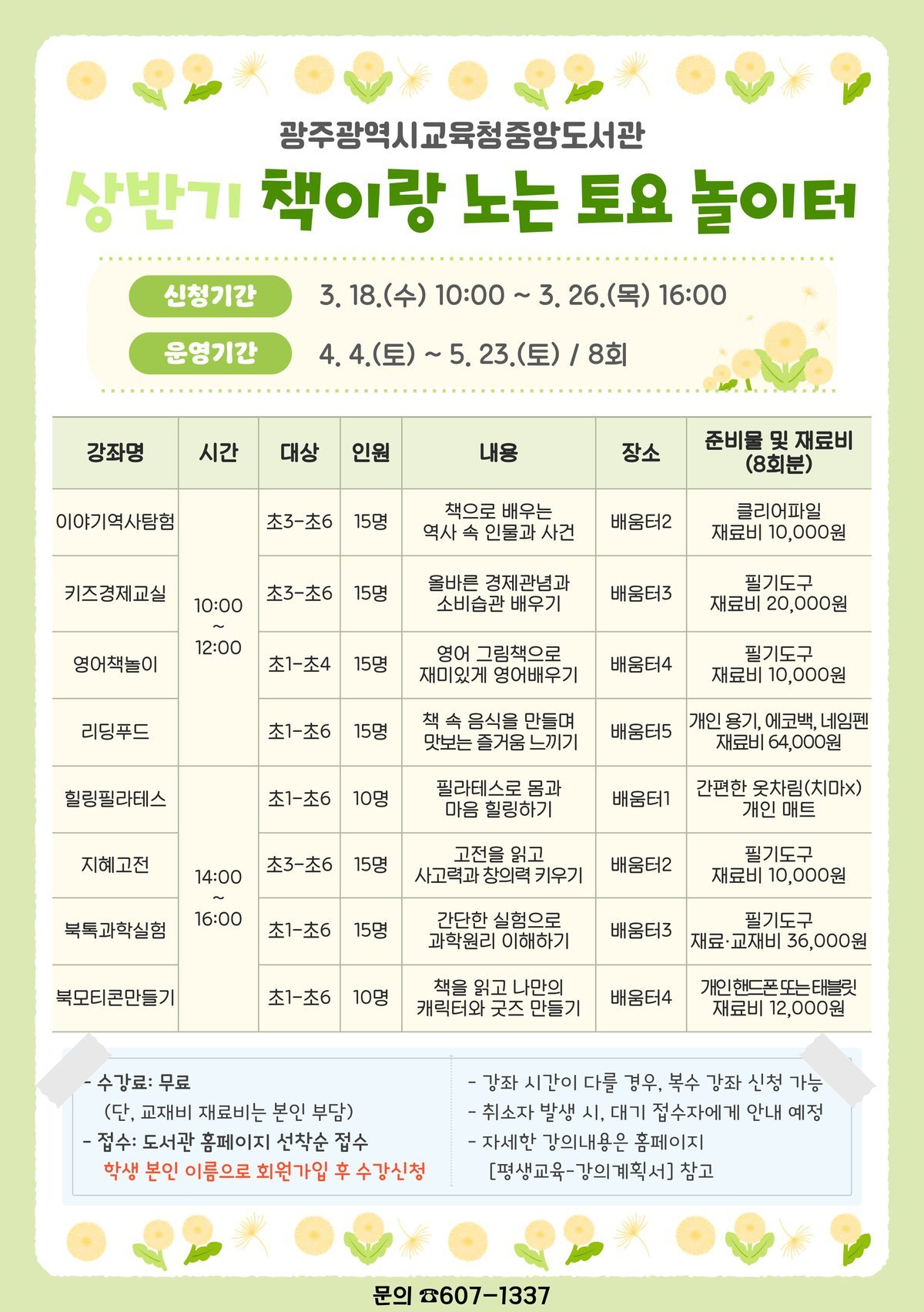 [충청뉴스큐] 광주광역시교육청중앙도서관은 오는 4월 4일부터 5월 23일까지 초등학생을 대상으로 '2026년도 상반기 책이랑 노는 토요 놀이터'프로그램을 운영한다.