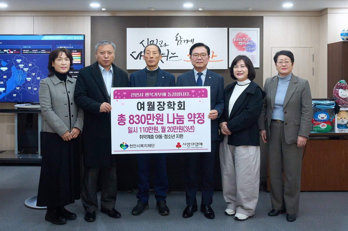 [충청뉴스큐] 천안시복지재단은 지난 10일 여월장학회가 저소득 아동 청소년을 위해 후원금 830만원을 기탁했다고 밝혔다.