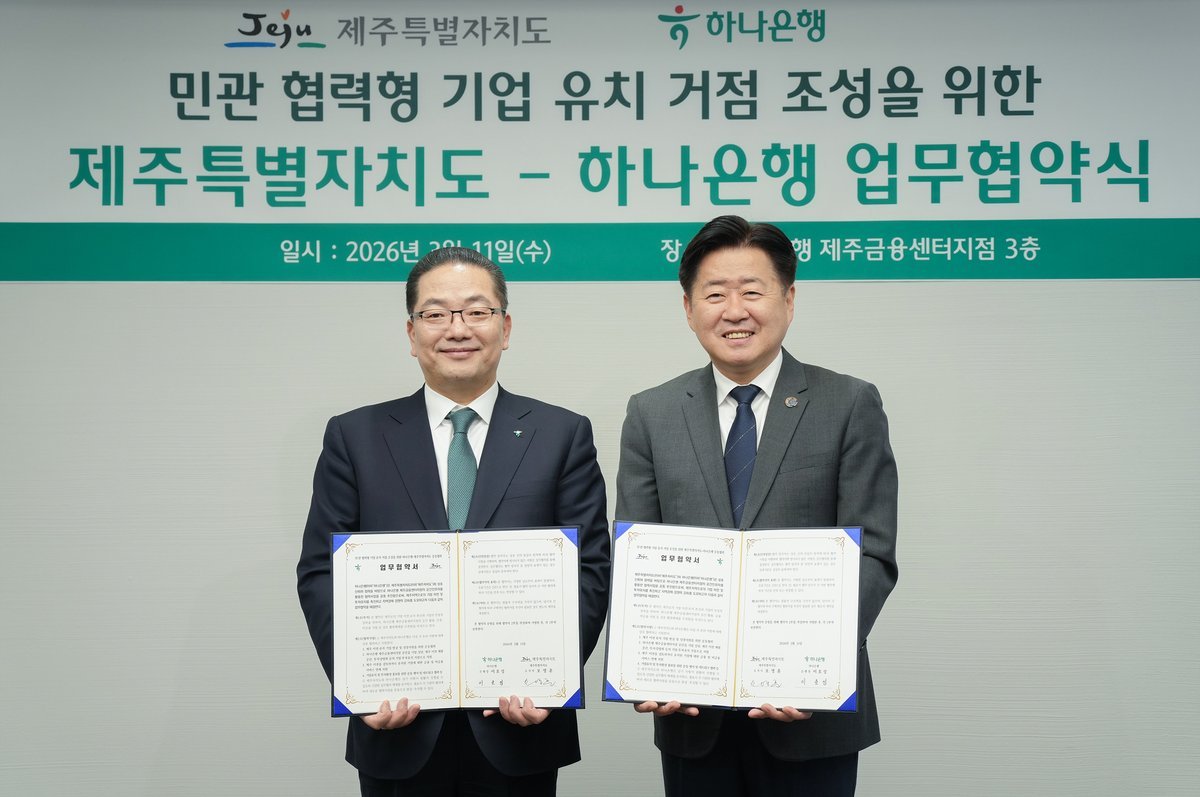 오영훈 제주도지사는 “제주는 에너지·인공지능·바이오 등 미래 전략산업을 중심으로 투자유치를 확대하고 있다”며 “하나은행과의 협력을 통해 금융 지원과 비즈니스 인프라를 함께 마련해 기업이 제주에 투자하고 성장할 수 있는 기반을 더욱 강화하겠다”고 말했다.