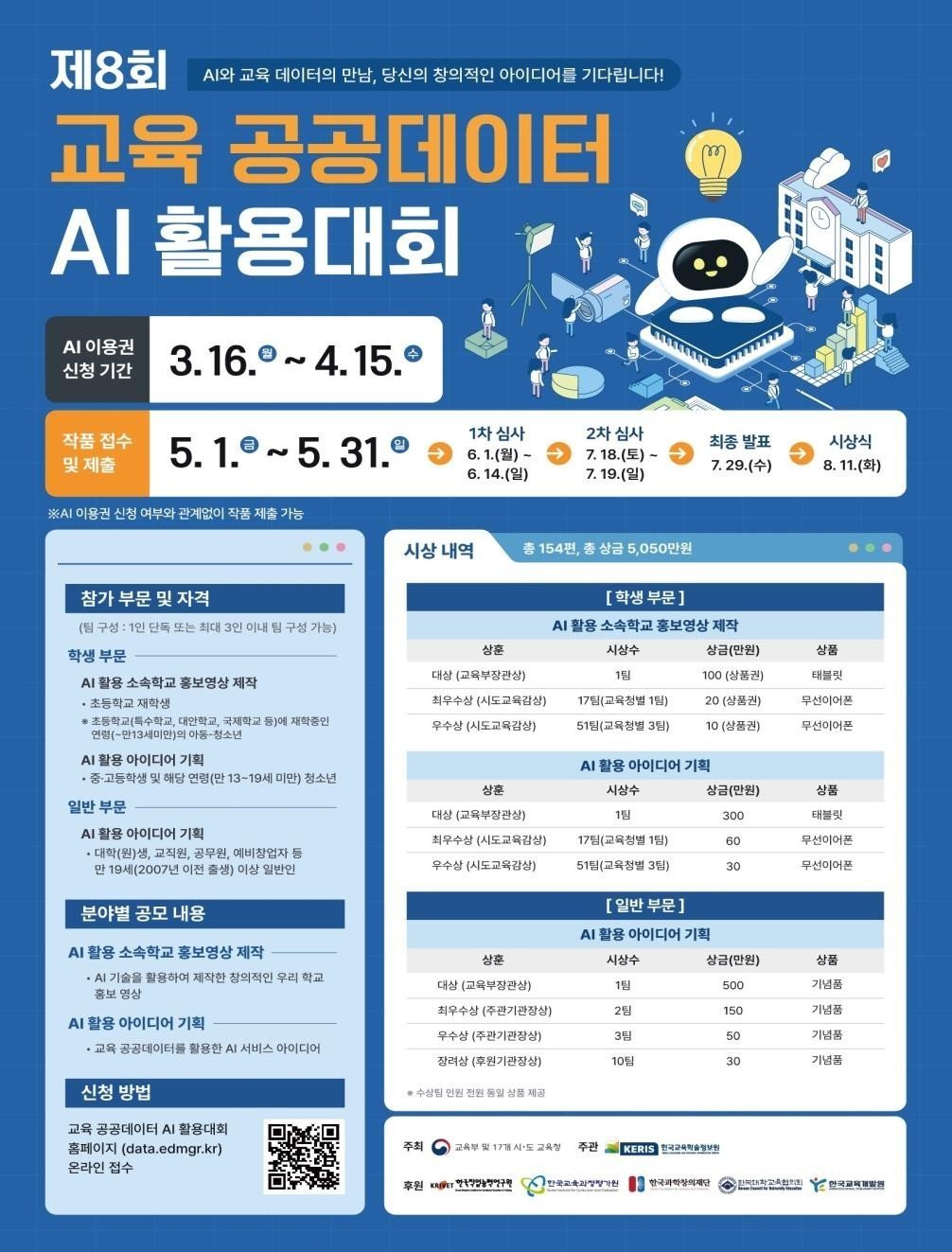 올해는 총 154편의 수상작을 선정하여 교육부 장관상과 시도교육감상, 주관‧후원기관상 등을 수여한다. 교육부 장관상 수상자에게는 시상 상금 외 100만 원 상당의 교육비와 부상을 후속으로 지원한다. 교육부 장관상을 수상한 일반부 수상자에게는 행정안전부에서 주관하는 ‘제14회 범정부 공공데이터 인공지능 활용 창업경진대회’의 참가 자격이 주어진다.