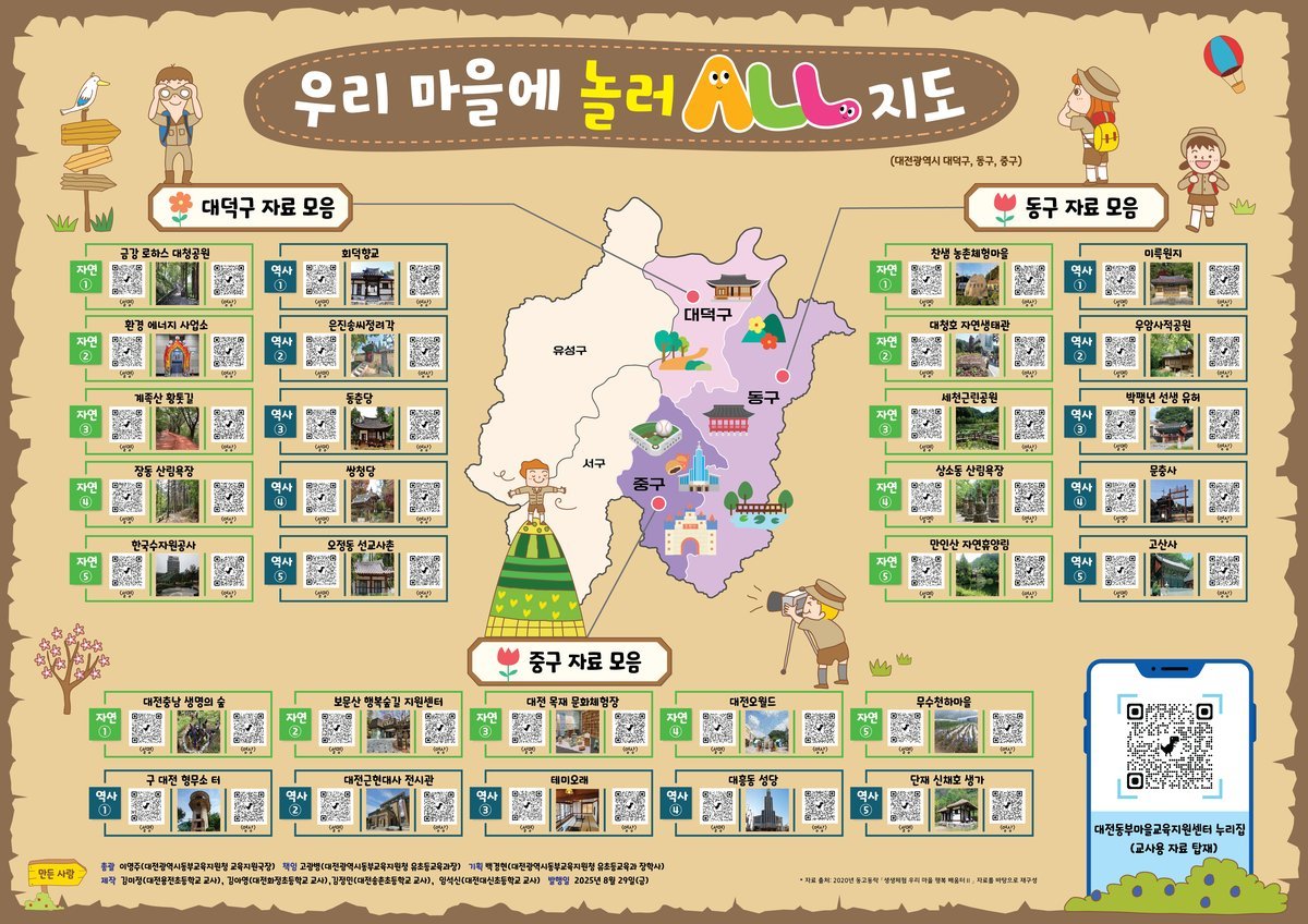‘우리 마을에 놀러올 지도’는 대전 동구와 중구, 대덕구 등 동부 지역의 자연생태와 역사 탐방 체험 장소를 한눈에 확인할 수 있도록 제작된 마을 교육 지도다.