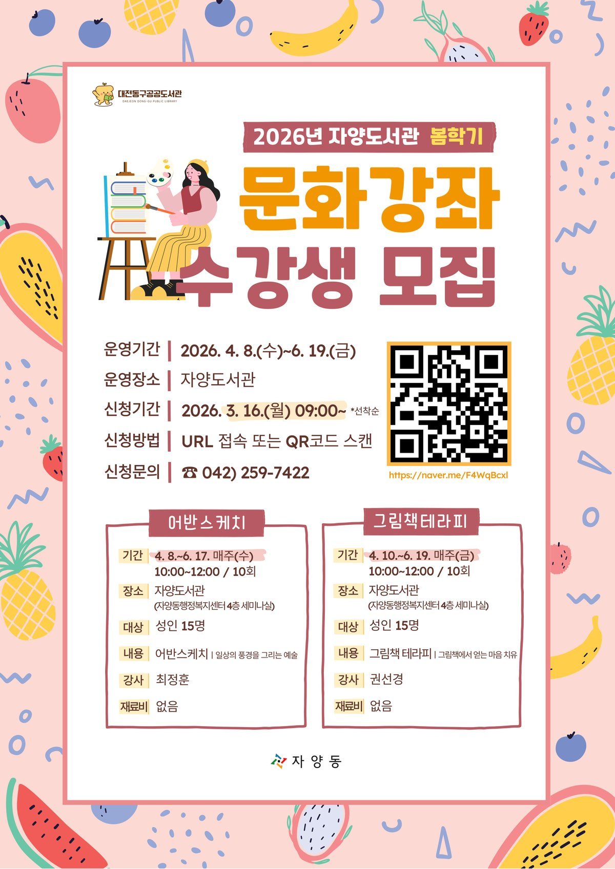 [충청뉴스큐] 대전 동구는 '2026년 자양도서관 봄학기 문화강좌'를 운영하며 이달 16일부터 동구 공공도서관 누리집을 통해 수강생을 선착순 모집한다고 밝혔다.