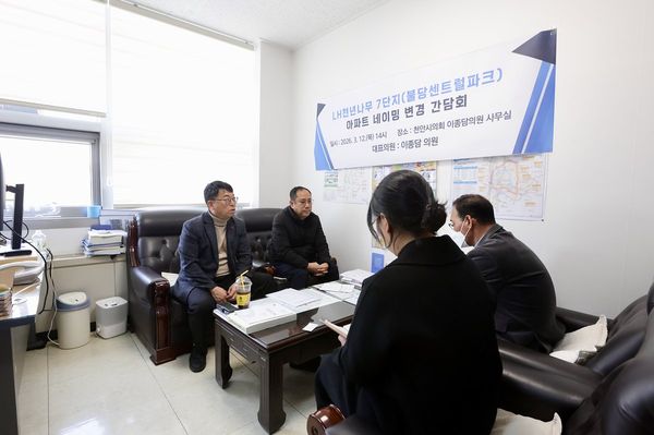 [충청뉴스큐] 천안시의회 이종담의원, "불당LH천년나무7단지 아파트 명칭 변경 간담회"개최. "주민의견 반영해 명칭 변경 차원 지원하겠다"천안시 이종담시의원은 12일 불당동 LH천년나무 7단지 아파트 명칭 변경과 관련해 주민 의견을 청취하고 관계 부서와 의견을 나누기 위한 간담회를 개최했다.