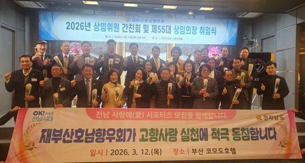 [충청뉴스큐] 전라남도는 12일 부산에서 열린 ‘2026년 재부산호남향우회 상임위원 간친회 및 제55대 상임의장 취임식’에 참석해 고향사랑 실천 도정설명회를 개최, 고향사랑 실천 확산을 위한 교류협력을 강화키로 했다.